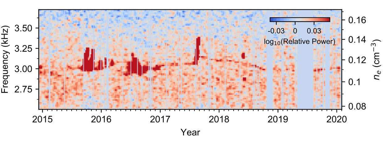 根据该信号,“旅行者1号”周围的电子密度从2013年开始上升,到2015年年中左右达到目前的水平,在这一期间,密度增加了约40倍。在他们分析的到2020年初结束的整个数据集中,宇宙飞船似乎处于类似的密度范围,不过有一些波动。