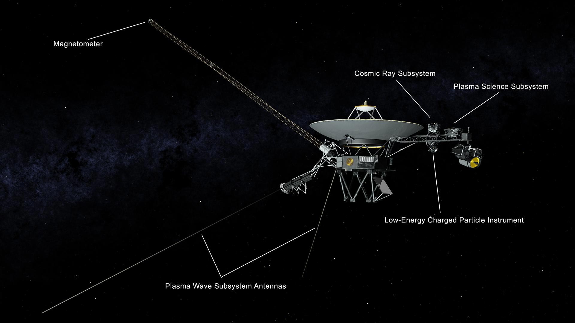 这些碰撞波揭示了关于星际介质密度的线索--这个值影响着我们对日球层形状、恒星如何形成甚至我们在银河系中的位置的理解。当这些波在空间中回响时,它们会振动它们周围的电子,这些电子则会以特定的频率发出,这取决于它们挤在一起的程度。音调越高电子密度就越高。“旅行者1号”的等离子波子系统--包括两个伸出在飞船后面30英尺(10米)长的“兔子耳朵”天线--就是为了听到这种声音而设计的。