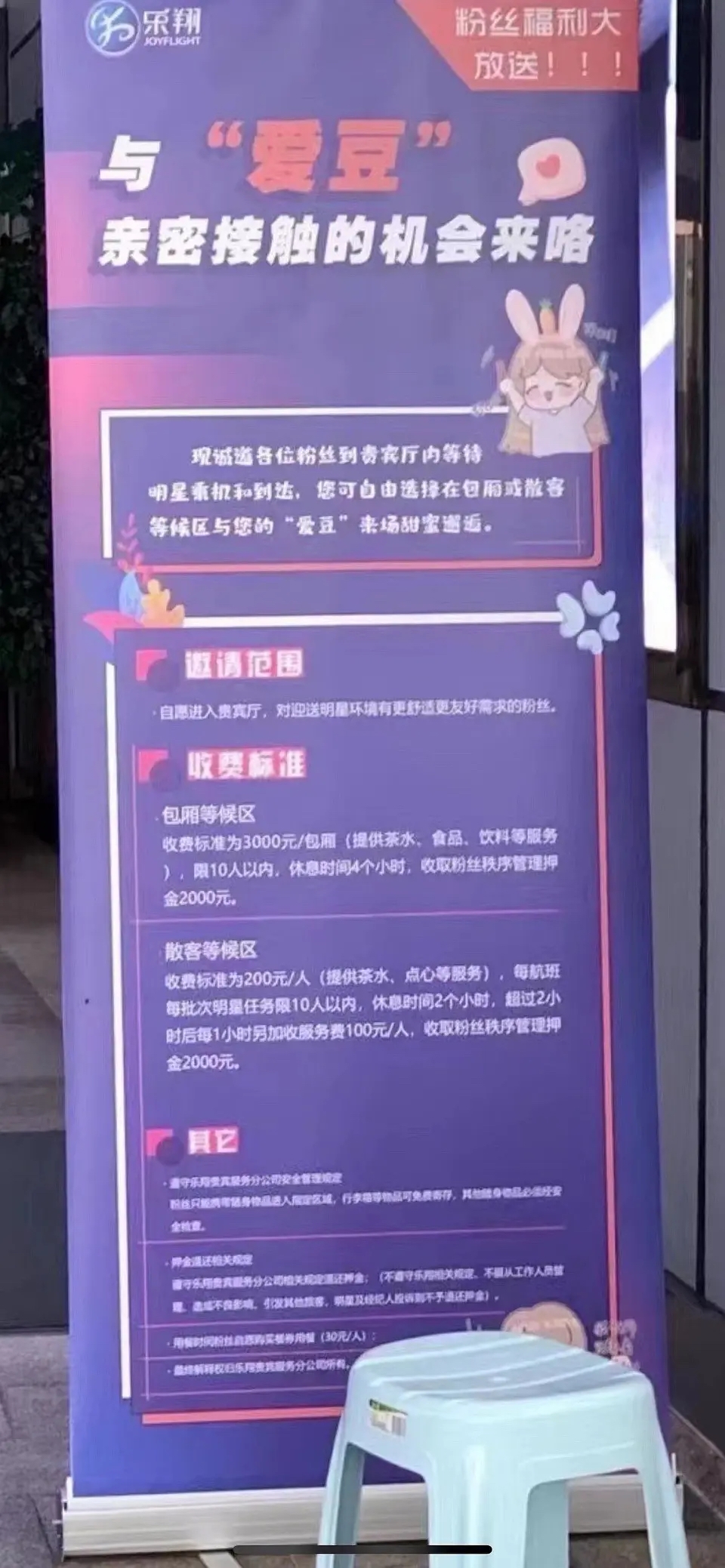 广告牌上写道:“现诚道各位粉丝到贵宾厅内等待明星乘机和到达,您可自由选择在包厢或散客等候区与您的“爱豆”来场甜蜜邂逅。”