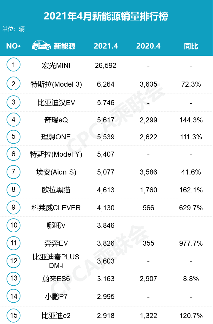 此外,其他品牌方面,比亚迪汉EV、奇瑞eQ、理想ONE、埃安S,销量均超过5000辆,且均为国产自主品牌。具体排名如下: