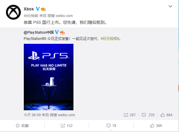 预售秒罄的索尼PS5国行版终于在今天迎来正式开售,令无数玩家没想到的是,索尼PS“老对手”,Xbox竟为其送上祝福。今日早间,PlayStation中国通过微博发文称,“PlayStation 5今日正式发售。”此举引来了微软Xbox官方的围观,同时转发并评论这条微博表示:“恭喜PS5国行上市。您先请,我们随后就到。”