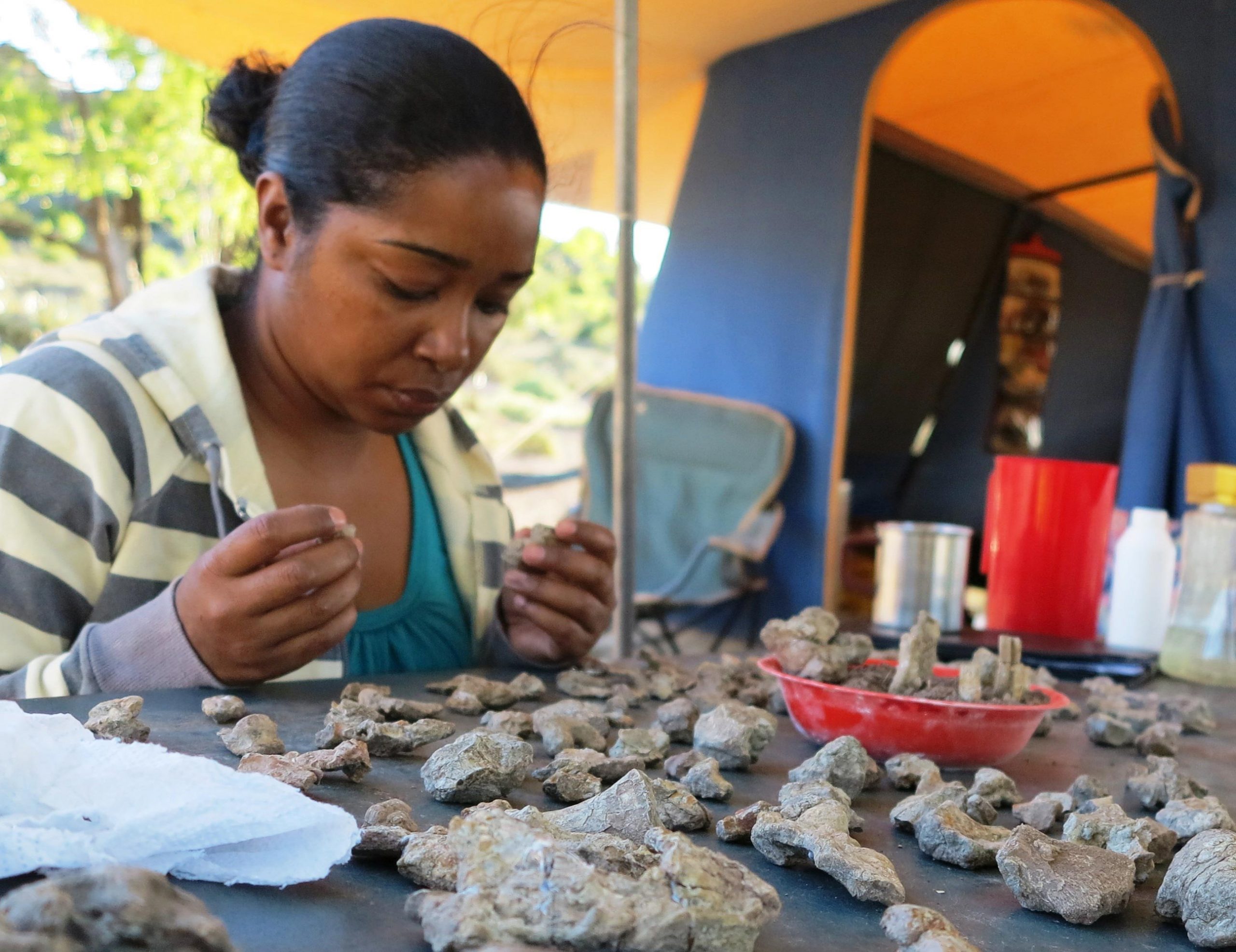 南非开普敦Iziko博物馆的藏品经理Zaituna Skosan在卡鲁盆地的野外工作中把一块破碎的化石粘在一起。
