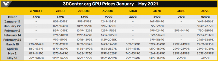 如今过去8个月了,RTX 30及RX 6000系列显卡的价格如何了呢?3DCenter统计了最近5个月来的情况,汇总了两家显卡从1月到现在的5月份价格情况,如下所示:
