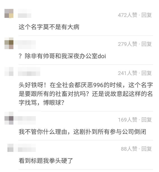 有人说他的拳头硬了,有人认为这是女主角自己pua自己,还有人说这个电视剧名字有病。从网友的反应不满发现,大家比较反感这类题材电视剧,因为这是鼓励加班。尤其是有过996工作经历的网友看来,这就是在找骂。