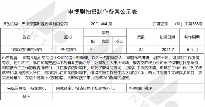 近日广电总局备案信息曝光了一部当代都市职场新剧,名为《我喜欢加班的理由》,看来是要讲述加班的故事。这部剧的制作方是深蓝影视,开机时间是今年7月,制作周期6个月,集数24集。