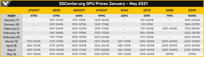 去年9月英伟达发布了RTX 30系列显卡,之后AMD也发布了RX 6000系列显卡。但因为全球挖矿火爆起来,导致显卡价格迅速上涨。近日外媒3DCenter对当前的显卡市场状况进行全面分析,统计了最近5个月来的情况。3DCenter汇总了两家显卡从今年1月份到5月份的价格情况,数据主要来自德国和奥地利的欧洲零售商。