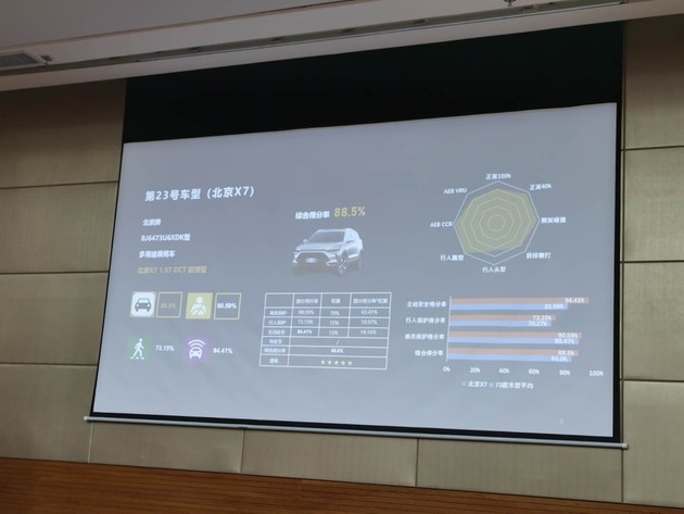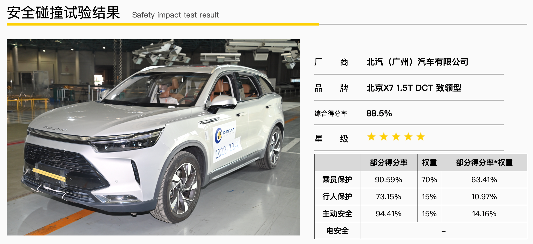 具体来看,三款车型测试的配置车型,BEIJING-X7 1.5T DCT致领型,综合得分率为88.5%,具体来看,主动安全得分率为94.41%,行人保护得分率为73.15%,乘员保护得分率为90.59%,获得了5星评价。