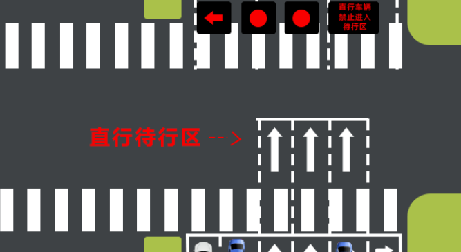 另外,若“直行待行区”内车辆饱和,后方车辆不得强行驶入或停留在人行横道线区域等候。