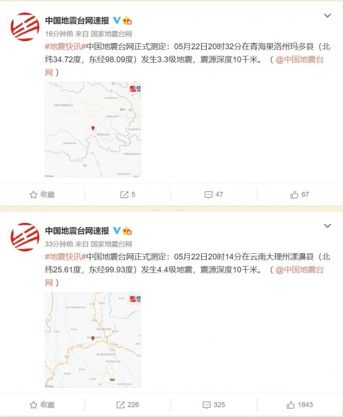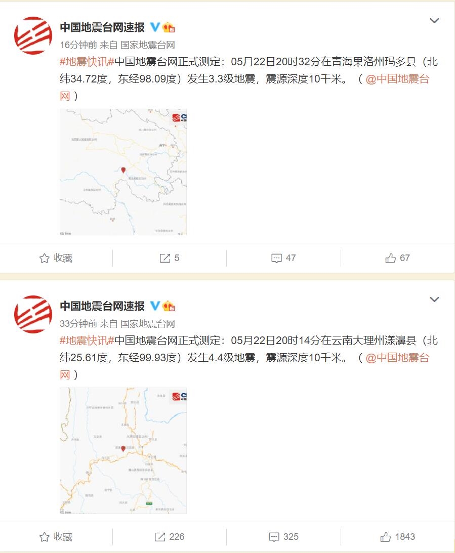 云南青海今晚8点再发地震:震源深度均为10千米