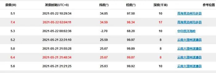 21日晚至22日上午,云南、青海两省接连发生地震,地震频度之高,震级之大一时间成为舆论焦点。根据中国地震台网的数据,从21日21时至22日11时,14个小时内,两省发生的5级以上地震达到6次,其中青海玛多县发生的地震高达7.4级。