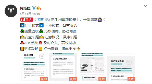 除了线下的提车培训 ,在网上,特斯拉官方微博也置顶了新手用车攻略,同样包括刹车相关内容。其中提到,请勿完全依赖能量回收制动以实现车辆减速,请务必及时通过刹车踏板制动车辆。