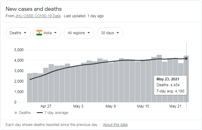 连日来,印度单日新增新冠死亡数持续维持高位。其中在5月19日,印度官方的数据显示,24小时内新增4529人死亡,创下全球单日死亡病例数最高纪录。
