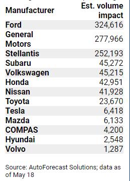 汽车制造商因芯片短缺在北美削减的产量预估