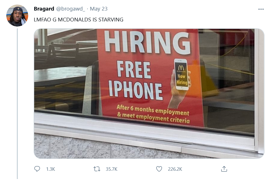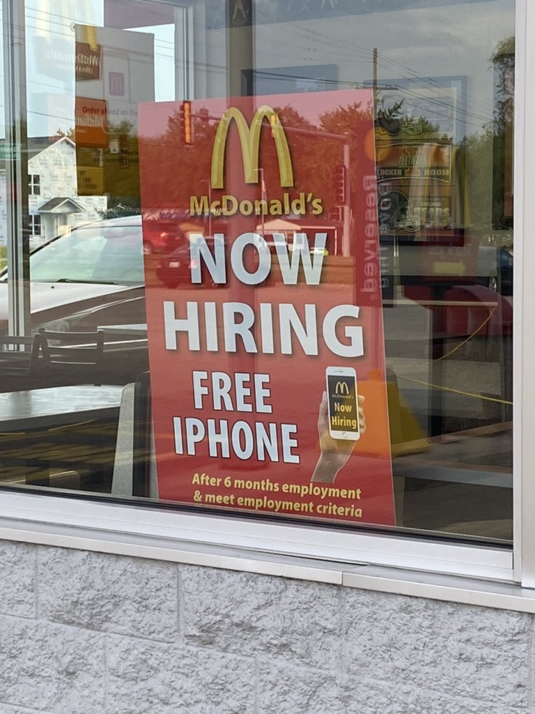 麦当劳、肯德基是很多人打零工的第一选择,平常都不缺人,但是现在的情况是招不到人。日前美国一家麦当劳想出奇招,来打工就能送iPhone手机。据报道,美国伊利诺伊州一家麦当劳加盟店在门口贴出了招工海报,给出的福利很奇特,承诺符合条件的员工在工作6个月后将获得一部免费iPhone,这一消息也很快火爆社交网络。