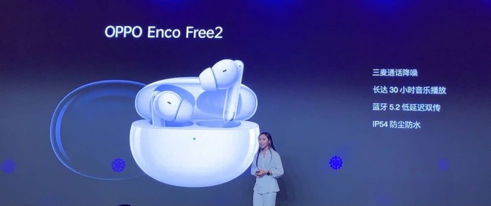OPPO 产品经理朱嘉诚上台介绍 Enco Free2,采用了个性化降噪设计,降噪深度最大可达 42dB