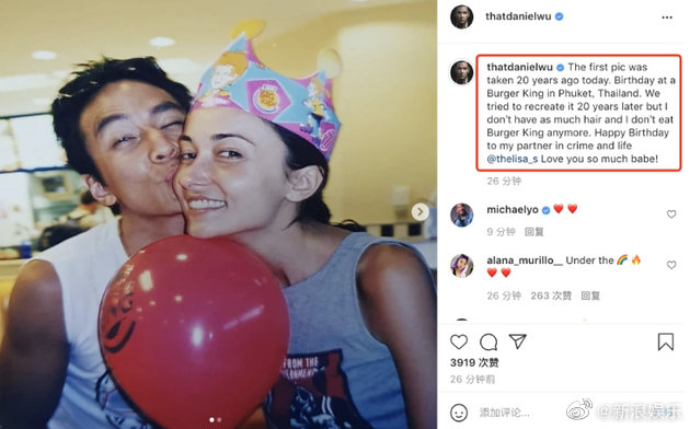 5月26日是吴彦祖夫人Lisa的43岁生日,27日,吴彦祖晒出重现两人拍的第一张合影为老婆庆生。阿祖配文“20年前的今天,我们拍下了第一张合影,20年后,我们尝试着去重塑它,但我已经没那么多的头发,我也不再吃汉堡王,祝福我的生活伴侣生日快乐,Loveyou so much babe !”
