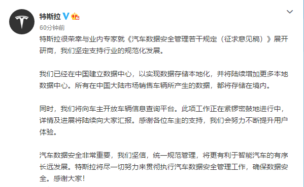 此前,特斯拉宣布已在中国建立数据中心,并称所有在中国大陆市场销售车辆所产生的数据,都将存储在境内,后续将增加更多本地数据中心。同时,特斯拉还将向车主开放车辆信息查询平台。