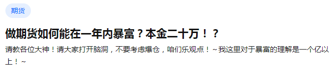 网络上有这样一个提问:本金二十万是否能通过炒期货一夜暴富,并在一年内赚一个“小目标”。评论中回答几乎都是不可能,或者说只是存在理论上的可能,更多则是靠“赌”、靠“运气”。