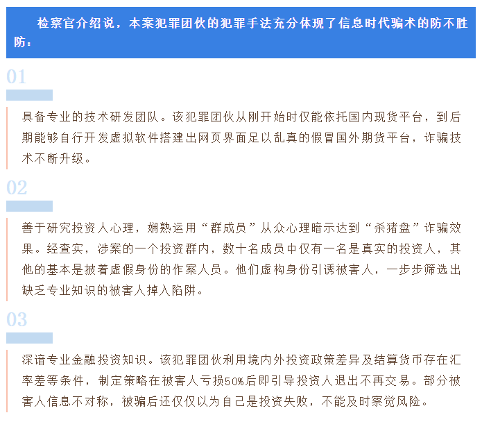 对于这一起涉及441人,损失8571万余元的虚假期货交易案,深圳市人民检察院的检察官就表示,犯罪团伙的手法主要三个:一是具备专业的技术研发团队,二是善于研究投资人心理,三是深谙专业金融投资知识。