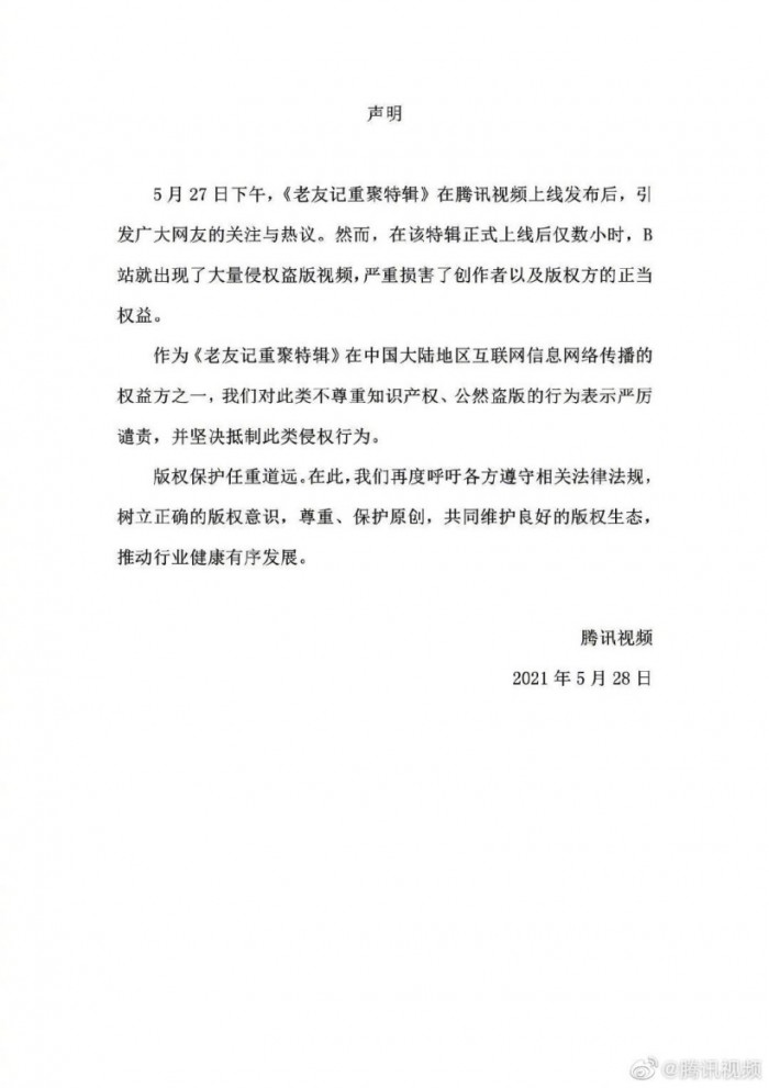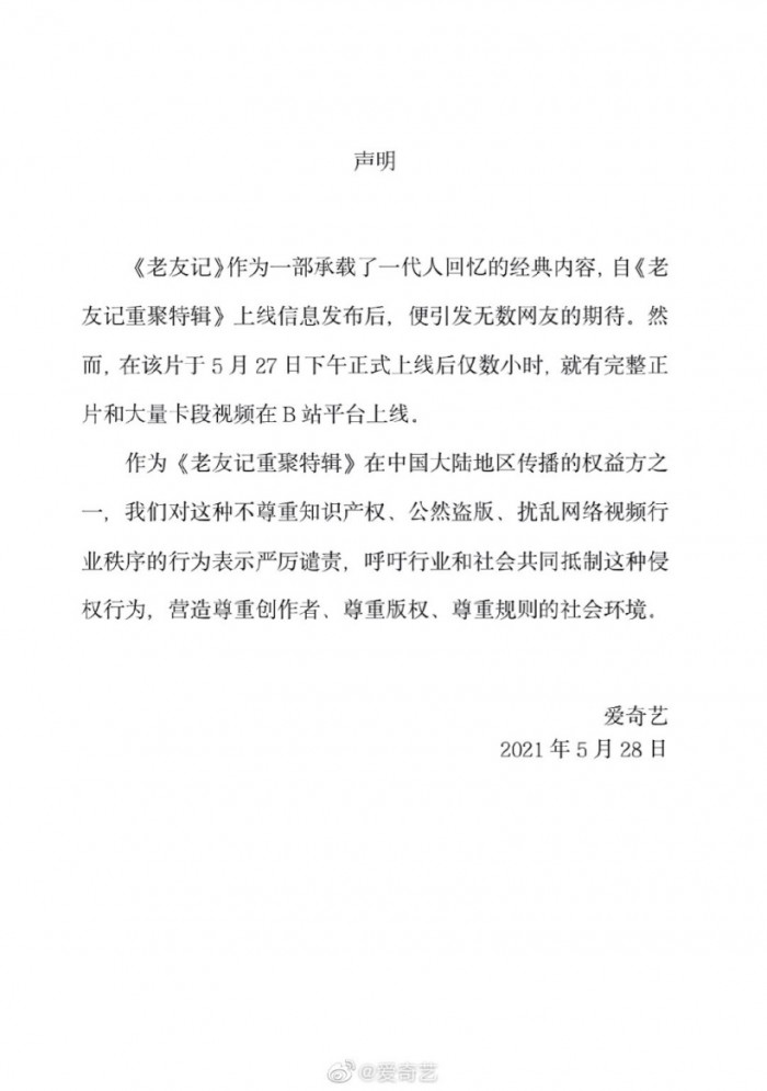 5月28日下午消息,今天15点50分,国内三大在线视频平台爱奇艺、优酷、腾讯同步刊发《声明》,谴责哔哩哔哩(B站)盗播《老友记重聚特辑》相关内容的行为。爱奇艺、优酷、腾讯表示系本剧在中国大陆地区传播权益方,B站的行为是不尊重知识产权、公然盗版、扰乱网络视频行业秩序。