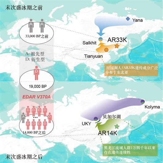 毛晓伟介绍,研究也对东亚北部人群的适应性遗传变异情况展开了探索。“此前研究发现其EDAR基因的V370A突变与东亚典型体征如更粗的毛发、更多的汗腺和铲形门齿有关。”毛晓伟说,“大规模的古东亚人群基因组研究能更直接、深入地揭示出该基因的出现时间和可能的选择机制。我们发现,除田园洞人及末次盛盛冰期之前的AR33K个体以外,EDAR基因的V370A突变出现在包括AR19K在内的所有已知的古东亚人群之中。这一结果表明,EDAR基因的V370A突变率在末次盛冰期快结束或之后不久的时间里可能升高,该结论也使得所估算EDAR突变基因出现时间的上限提早并更为精确。”