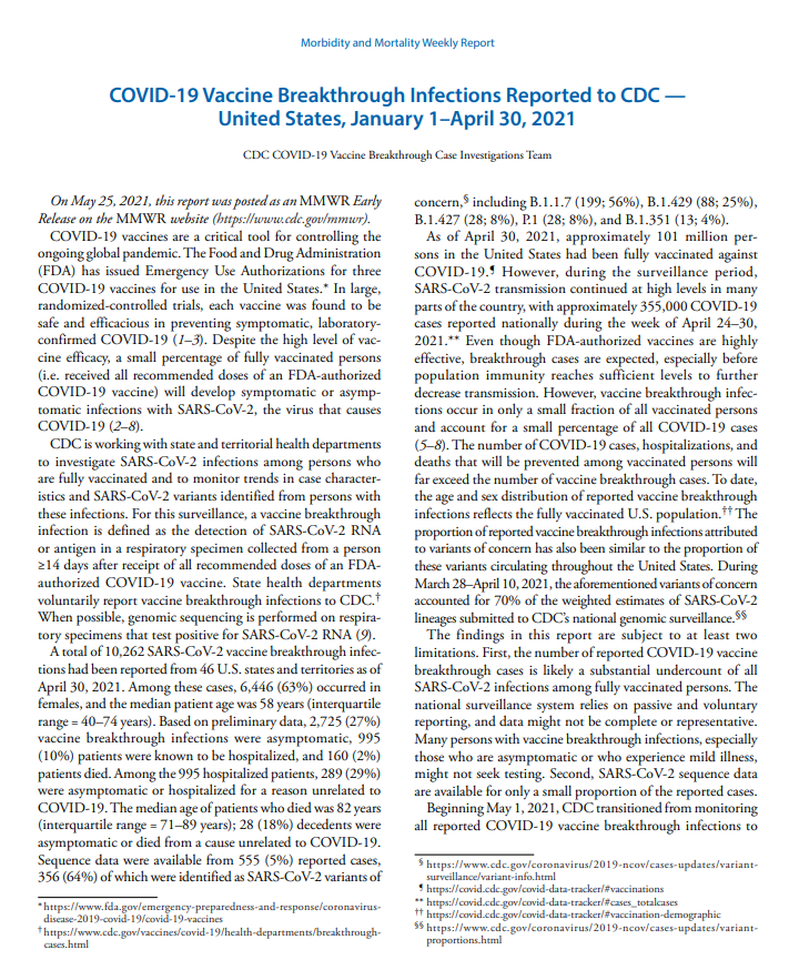 CDC的报告记录了大量所谓的 “突破性感染”病例。这些是在所有推荐剂量的疫苗接种后至少14天的受试者中出现的COVID-19阳性病例。