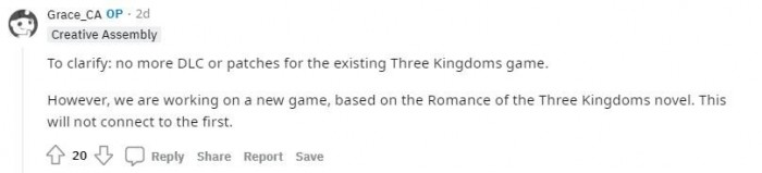 Grace强调《全面战争:三国》不会再推出新DLC或更新。目前他们正在制作一款基于《三国演义》小说开发的全新作品,不会遵循《全面战争:战锤》模式(即新游戏包含老游戏内容),这款新作与《全面战争:三国》没有直接联系。