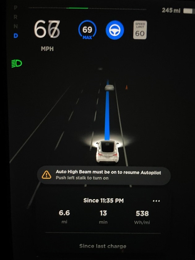 从曝光的图片来看,取消毫米波雷达后的Autopilot工作界面与此前差别不是很大,不过需要注意的是,纯视觉版本的Autopilot在使用时必须打开自动远光灯。