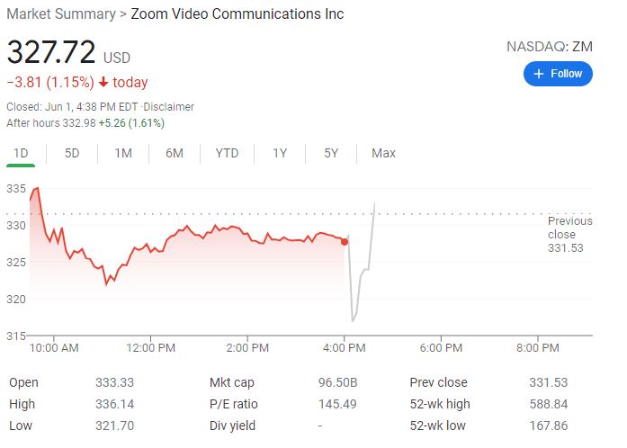 当日,Zoom股价在纳斯达克常规交易中下跌3.81美元,报收于327.72美元,跌幅为1.15%。在随后截至美国东部时间周二下午4点19分(北京时间周三凌晨4点19分)的盘后交易中,Zoom股价再度下跌6.20美元,至321.52美元,跌幅为1.8%。过去52周,Zoom最高价为588.84美元,最低价为196.10美元。