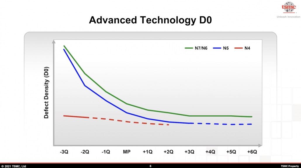 除了 N7 和 N5,台积电还展望了 N6 和 N4 等工艺。虽然 N4 工艺仍处于早期阶段,但 7nm(N7 和 N6)工艺的缺陷密度已经有所下降。