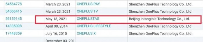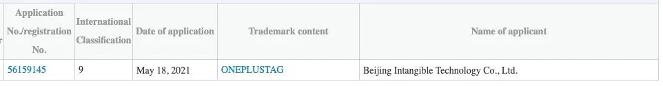 该商标是通过 Beijing Intangible Technology 公司于 2021 年 5 月 18 日提交申请的,从这个名字来看,OnePlus Tag似乎是一个物品追踪器,你可以用它来追踪你的个人物品,如钥匙、钱包和包。OnePlus Tag可能类似于三星Galaxy SmartTag和苹果AirTag。
