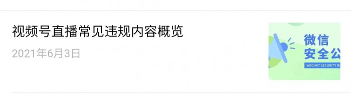 6月3日,“微信安全中心”公众号发布《视频号直播常见违规内容概览》称,根据视频号直播日常安全监管过程中实际发现的违规现象,对平台上较为常见的违规内容进行梳理。视频号直播的绿色健康生态,需要大家一起创造和维护,请大家共同遵守平台内容规范。