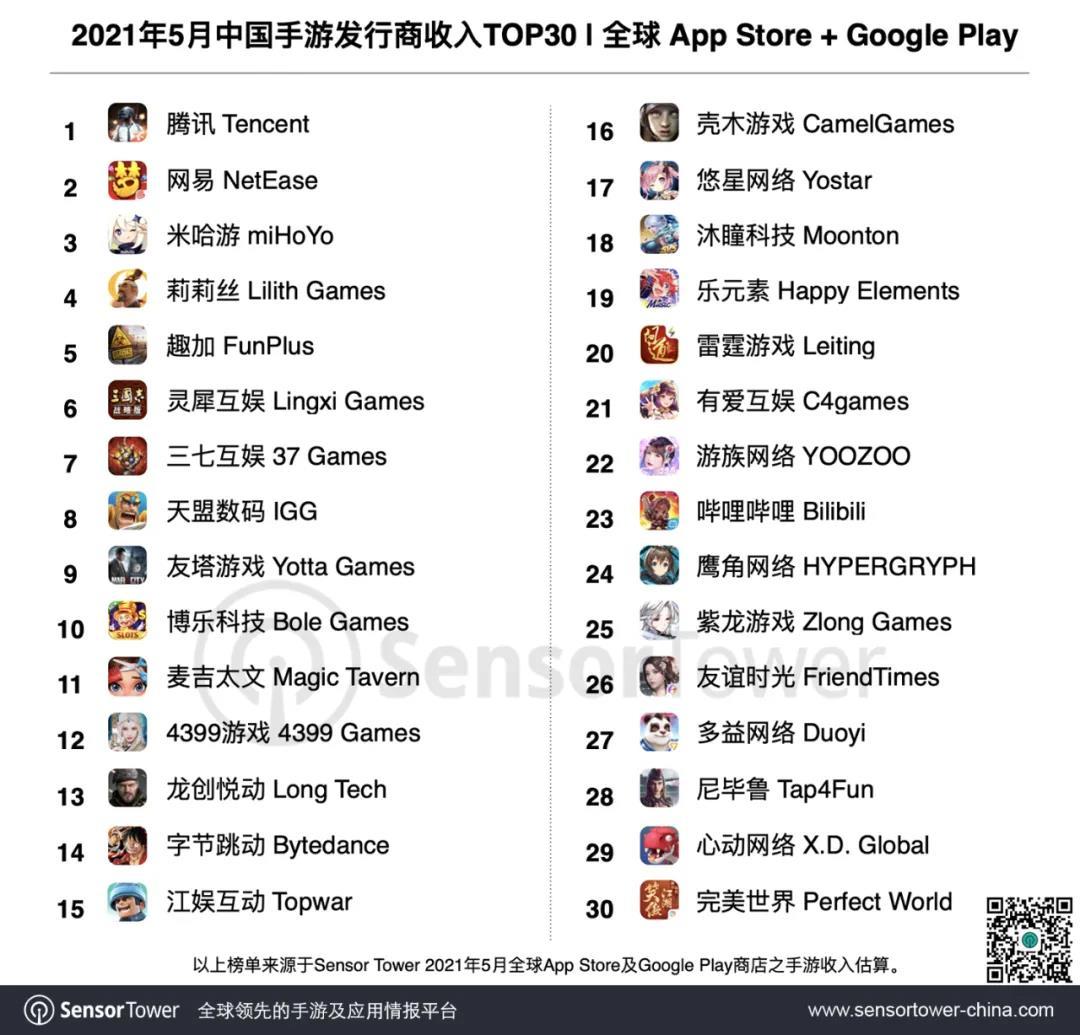 据Sensor Tower最新数据显示,2021年5月,中国手游发行商全球收入排行榜中,米哈游位列第三,仅次于腾讯、网易。值得注意的是,米哈游的收入73.4%来自海外市场,其中美国占22%、日本占21%(未统计国内第三方Android渠道)。