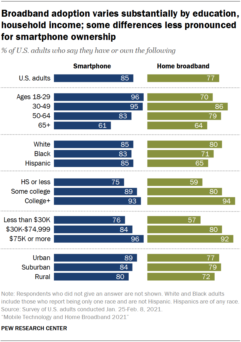 此外,现在有 85% 的成年人表示他们拥有智能手机,高于 2019 年的 81%,智能手机保有量在主要人口群体中相对普遍,但在采用率方面仍然存在一些重大差距,包括年龄差距。虽然在过去两年中,拥有智能手机的 65 岁及以上成年人的比例从 53% 增加到 61%,但这个年龄段的人报告拥有此类移动设备的可能性仍远低于年轻群体。