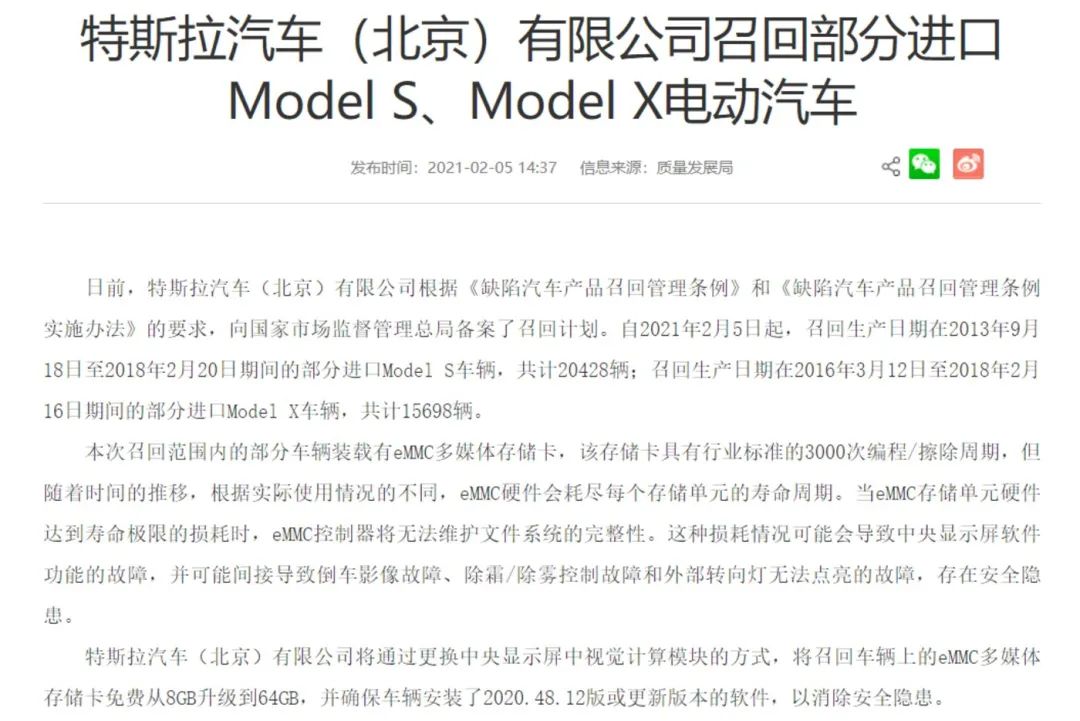 2021年2月特斯拉在华召回信息,截图自自国家市场监督管理总局官网