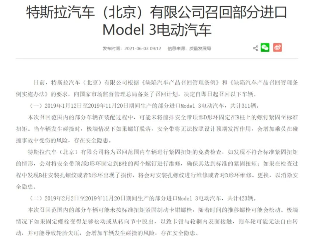 只不过,相较于之前的被动召回,在业内看来,今年的两次召回都属于特斯拉的主动召回。据第一财经报道,其实在本月初的召回之前,特斯拉中国就已向相关部门就召回进行备案。