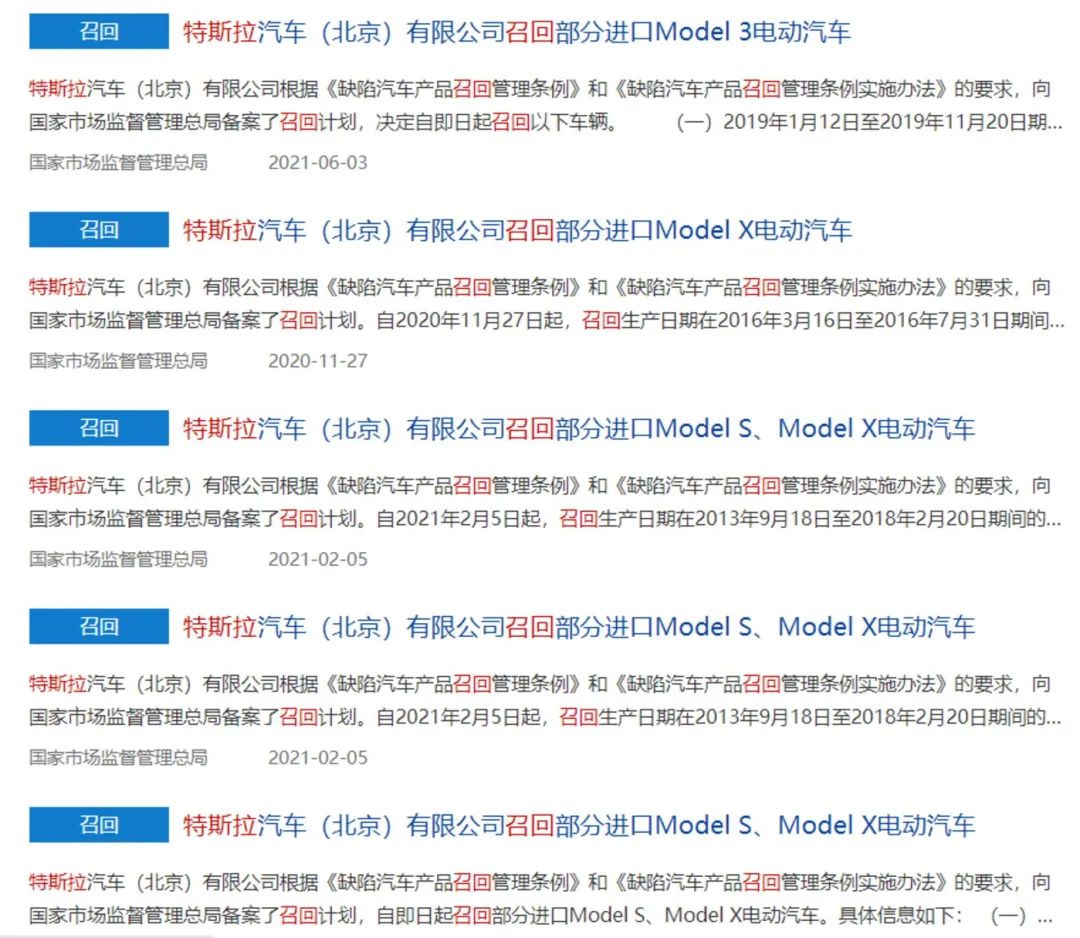 特斯拉在华登记在案的召回信息,截图自国家市场监督管理总局官网