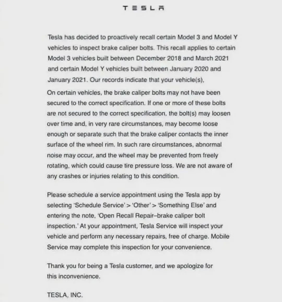 而对于后面部分车辆而言,召回原因与美国召回车辆是一致的,都是由于制动卡钳螺栓未按标准规固定,以致在极端情况下导致轮胎失压,会增加车辆发生碰撞的风险,存在安全隐患。