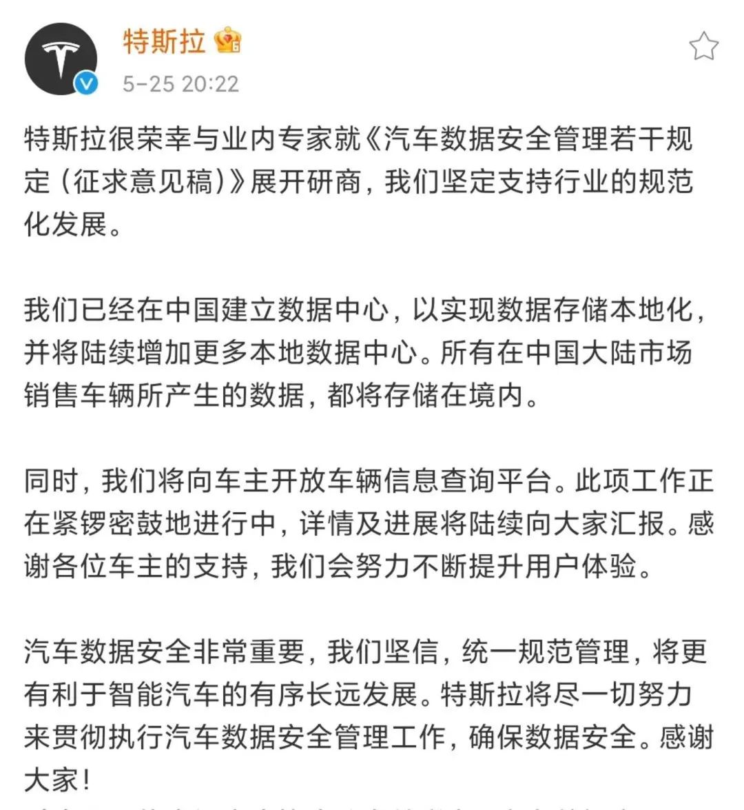 特斯拉在官方微博并称,将向车主开放车辆信息查询平台,此项工作正在紧锣密鼓地进行中,“特斯拉将尽一切努力来贯彻执行汽车数据安全管理工作,确保数据安全。”