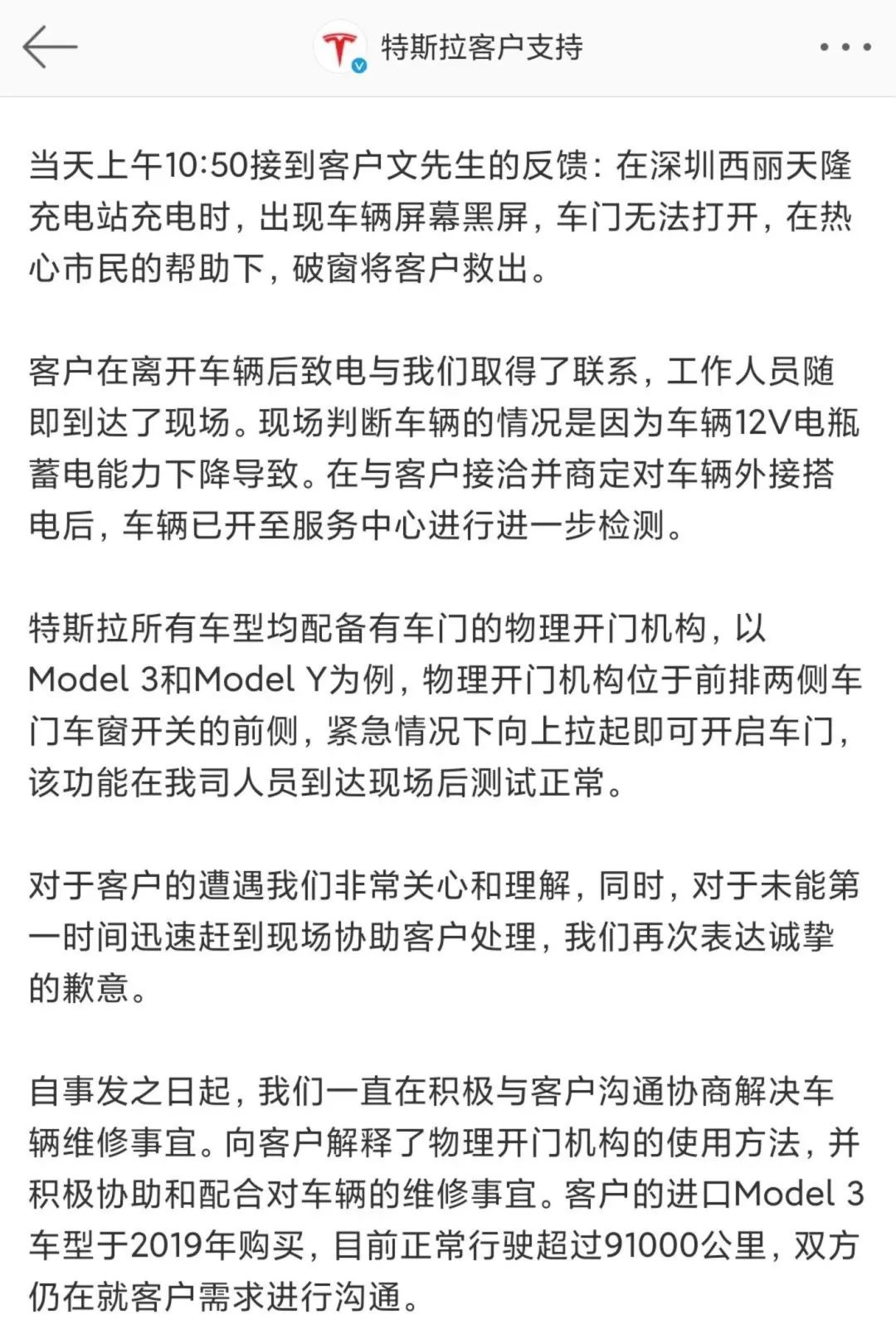 特斯拉就深圳车主遭遇声明,截图自特斯拉客户支持官微