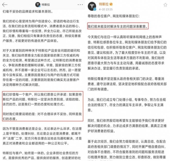 特斯拉时隔一日的声明对比,图源特斯拉官微