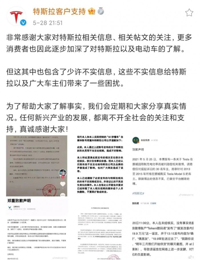 上月28日晚间,特斯拉官方旗下微博矩阵“特斯拉客户支持”官微中出现了一条推文,内容主要是特斯拉晒出了多封来自一些自媒体的道歉信。在业内看来,这些道歉的出现大概率源于特斯拉法务部的出面。
