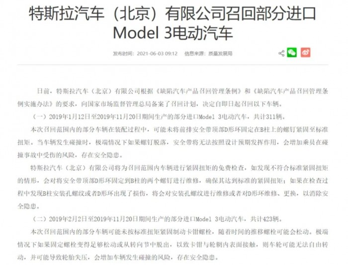 “维权门”余温犹在,特斯拉再陷车辆召回旋涡之中。近日,特斯拉中国应相关国内法律法规要求,向国家市场监督管理总局备案了召回计划,决定召回2019年生产的部分进口Model 3车辆,并表示召回原因是由于这部分车辆安全带和车辆制动装置存在问题,易造成隐患。