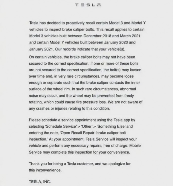特斯拉美国召回邮件,图源Electrek