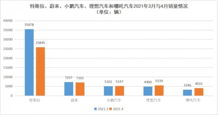 特斯拉、蔚来、小鹏汽车、理想汽车和哪吒汽车2021年3月与4月销量情况,数据来源于乘联会,连线出行制图