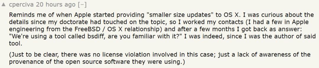 当苹果准备为 OS X 提供“更小尺寸的更新”时,我很好奇实现细节,因为我博士阶段的研究涉及到这个话题,所以我询问了苹果相关研究团队的成员,几个月后我得到回复:“我们正在使用一个名为 bsdiff 的工具,你熟悉它吗?”我确实很熟悉,因为我是这个工具的作者。