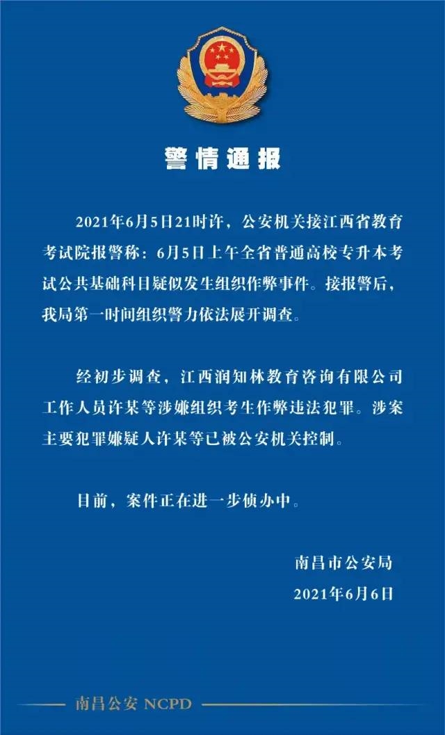 6月6日下午,据南昌公安通报,6月5日21时许,公安机关接江西省教育考试院报警称,6月5日上午全省普通高校专升本考试公共基础科目疑似发生组织作弊事件。经初步调查,江西润知林教育咨询有限公司工作人员许某等涉嫌组织考生作弊违法犯罪。涉案主要犯罪嫌疑人许某等已被公安机关控制。