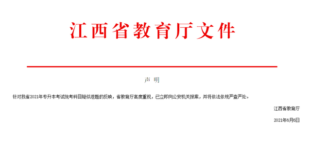 6月6日0时52分,江西省教育厅官方声明,表示疑似泄题的反映,省教育厅高度重视,已立即向公安机关报案,并将依法依规严查严处。