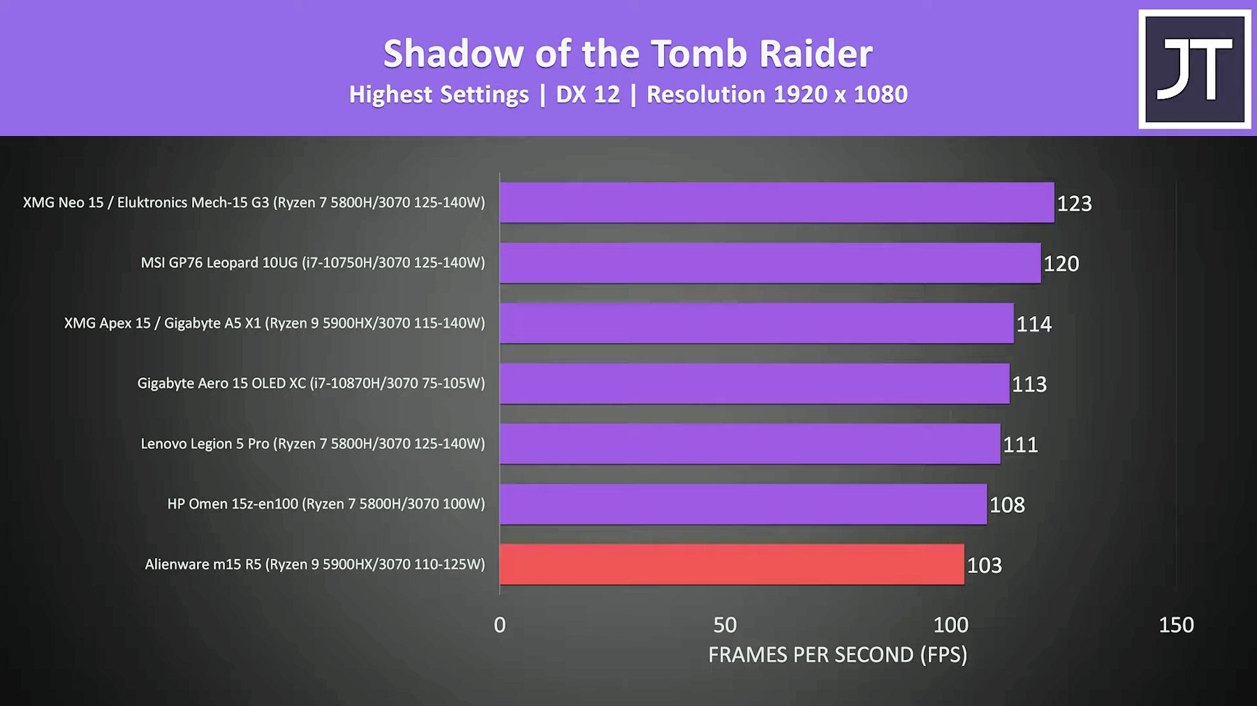 油管博主Jarrod's Tech测试后发现,这个残血版的RTX 3070性能损失非常大,125W性能释放的它还不如其他的100W版本,对比最好的140W版本更是低了12.3%。