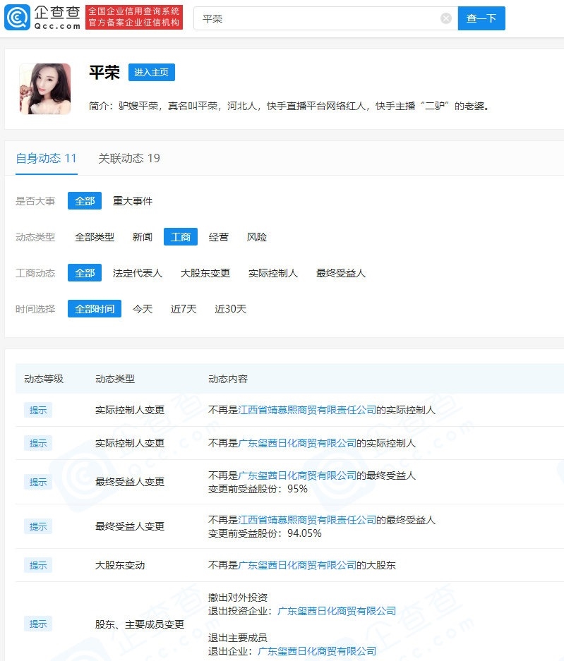 值得注意的是,企查查APP显示,主播“平荣”近日紧急退出了多家公司,不再担任广东玺茜日化商贸有限公司实际控制人、最终受益人,不再担任江西省靖慕熙商贸有限责任公司最大股东、最终受益人、实际控制人。